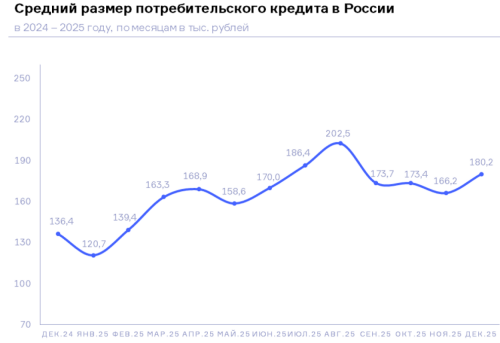 Средний размер выданного в декабре 2025 года потребительского кредита составил 180,2 тыс. рублей, что на 8,4% больше ноябрьского показателя (166,2 тыс. руб.). Об этом сообщает Национальное бюро кредитных историй (НБКИ) на основе данных кредиторов.